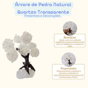 A Árvore de Pedra Natural de Quartzo Transparente é uma peça única que alia beleza e poder energético. O quartzo transparente é conhecido por suas propriedades purificadoras e amplificadoras, sendo perfeito para trazer luz e positividade ao seu lar ou escritório.