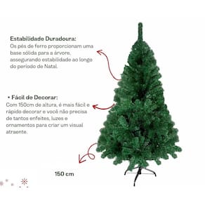 Sua estrutura robusta, composta por PVC, ferro, plástico e metal, garante durabilidade e estabilidade. Com 380 galhos densos, ela proporciona um visual exuberante que permite personalizar sua decoração com enfeites à sua escolha. A base de metal assegura que a árvore permaneça firme durante toda a temporada.
