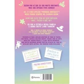 Dizem por aí que eu sou muito irritante. Mas sou apenas fofa demais! Ah, e o meu apelido "priminha irritante"? meus primos sempre me chamam assim. Acho que eles têm os seus motivos. Mas... fazer o quê, né? Eu sou a estrela dessa família e agora deste livro também! Qual a origem da minha varinha? Ela realmente tem poderes secretos? E quais são esses poderes? Preparem-se para a melhor aventura de todos os tempos. Com portal, castelo, gelatina gigante, dragão, bobo da corte, bruxa má, varinha mágica, e, claro, muitos unicórnios. Mas muitos unicórnios mesmo! Prestem atenção em todos os detalhes desta história, pois segredos serão revelados.