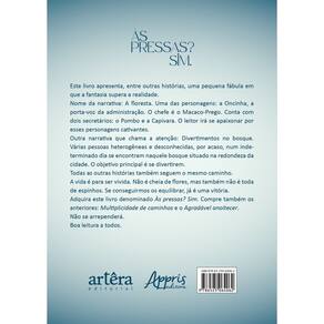 Este livro apresenta, entre outras histórias, uma pequena fábula em que a fantasia supera a realidade. Nome da narrativa: A floresta. Uma das personagens: a Oncinha, a porta-voz da administração. O chefe é o Macaco-Prego. Conta com dois secretários: o Pombo e a Capivara. O leitor irá se apaixonar por esses personagens cativantes. Outra narrativa que chama a atenção: Divertimentos no bosque. Várias pessoas heterogêneas e desconhecidas, por acaso, num indeterminado dia se encontram naquele bosque situado na redondeza da cidade. O objetivo principal é se divertirem. Todas as outras histórias também seguem o mesmo caminho. A vida é para ser vivida. Não é cheia de flores, mas também não é toda de espinhos. Se conseguirmos os equilibrar, já é uma vitória. Adquira este livro denominado Às pressas? Sim. Compre também os anteriores: Multiplicidade de caminhos e o Agradável anoitecer. Não se arrependerá. Boa leitura a todos.