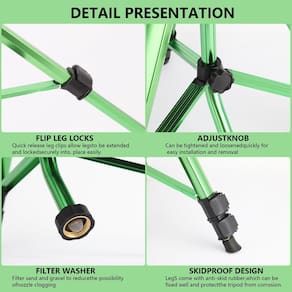- Ajustável e fácil de usar: as pernas extensíveis do tripé (38 a 101 cm) com clipes de travamento seguros permitem ajustes de altura personalizáveis. Um anel de vedação de filtro de borracha integrado evita entupimento de detritos, enquanto o conector ergonômico da mangueira de pescoço de ganso garante uma fixação sem complicações a mangueiras de jardim padrão de 1,9 cm.