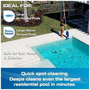 O aspirador portátil para piscina é fácil de usar e manter, basta apertar o botão para começar a aspirar. Ele pode ser utilizado manualmente ou preso ao conjunto de postes de piscina incluído para limpar áreas inacessíveis por limpadores automáticos de piscina. Também é compatível com qualquer poste de piscina telescópico padrão.