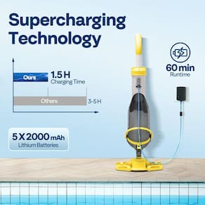 - CARREGAMENTO RÁPIDO E BATERIA DE LONGA DURAÇÃO: O aspirador de piscina sem fio VIVOHOME possui 5 baterias de lítio recarregáveis de 2.000 mAh, fornecendo até 60 minutos de limpeza ininterrupta; com um rápido tempo de carregamento de 1,5 horas, basta ativar o interruptor para acessar a porta de carregamento, facilitando a recarga e tornando a limpeza mais econômica e conveniente