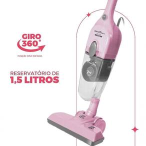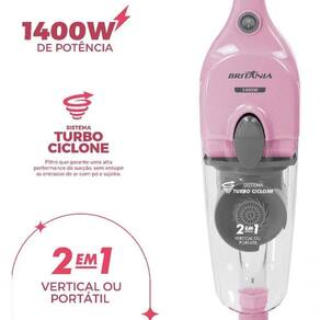 Aspirador de Pó 2 em 1 Britânia Ellegance Pink com 1400W de potência, filtro ciclone lavável, capacidade de 1,5L, design vertical e portátil, e alcance de 5,5m.Tipo de coletor