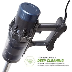 Design 2 em 1 que permite uso como aspirador vertical ou portátil. Possui alto poder de sucção e tecnologia Deep Cleaning para limpeza profunda. Reservatório removível e fácil de esvaziar.Tipo de coletor