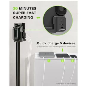 Carregador de Parede Deluxe – O aspirador Greenworks Deluxe possui funções adicionais de carregamento USB-C para alimentar pequenos dispositivos eletrônicos, contando com (2) saídas USB-C e (1) USB-A. Tempo de Funcionamento – Até 45 minutos de uso contínuo quando totalmente carregado. Recarregue rapidamente em 30 minutos ou menos com o carregador super rápido de 200W da Greenworks, que inclui (2) portas de carregamento USB-C e (1) porta USB-A. Nova Bateria de Alta Capacidade 24V 4Ah – Banco de energia de 40.000mAh com capacidade de carregar dispositivos portáteis, incluindo telefones e tablets via USB-C e USB-A. Tela de Display Digital – Acompanhe facilmente o tempo de funcionamento, modo de potência e mensagens de erro em uma única tela touchscreen. Aspirador Vertical Sem Fio – Motor sem escovas de 500W com (3) modos de potência, oferecendo até 170 watts de ar de poder de sucção, (5) luzes LED para iluminar espaços de difícil acesso, e filtro HEPA lavável e reutilizável. O pacote inclui: