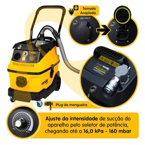 Aspirador de pó profissional com 1600W de potência, ideal para uso diário ou profissional. Possui função de sucção e sopro, filtro HEPA de alta eficiência, sistema START/STOP para automação com ferramentas pneumáticas, e capacidade de aspirar sólidos e líquidos. Conta com saco coletor de 30L, sistema de filtragem em 3 etapas, rodas para mobilidade e tubo telescópico ajustável.Tipo de coletor