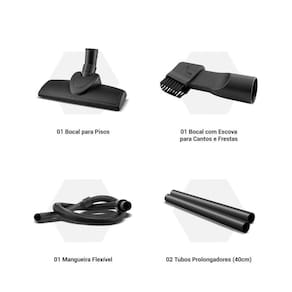 Acessórios: Acessório para cantos com escova, acessório para pisos e carpetes, 2 tubos prolongadores.