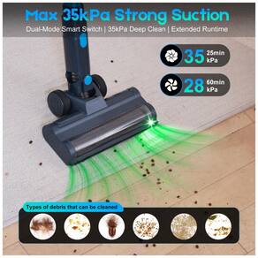 Aproveite o poderoso aspirador de pó sem fio da PRAVOLE, com incríveis 35kPa de sucção para limpezas profundas. Com motor de 190W, oferece 25min de sucção de 35kPa e 60min de 28kPa em modo padrão. Ideal para limpeza intensiva de tapetes, pelos de animais e detritos teimosos. Com tempo de execução de até 60 minutos, bateria de longa duração, capacidade de 1,2L e filtragem eficiente, é perfeito para limpar carpetes, pisos duros, sofás, escadas e muito mais. Leve, versátil e com escova anti-emaranhamento em V, é o aliado perfeito para lares com animais de estimação.