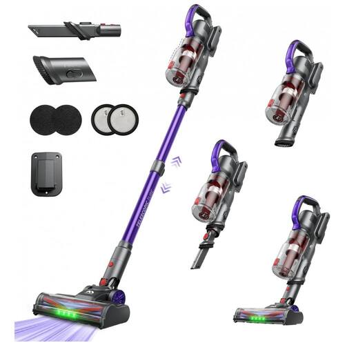 Recurso Especial: Motor sem escova de 450W, Sucção super forte de 45KPA, 60 minutos de autonomia da bateria, Sistema de filtragem de alta eficiência com 6 camadas, Escova antienrolamento, Design autônomo, Estação de armazenamento e carregamento do aspirador, Filtro de tecido e filtro de esponja, Copo de poeira de 1L de grande capacidade, Tubo retrátil, Escova rotativa de 270 graus, Luz de escova LED verde, Ferramenta multifuncional para frestas,