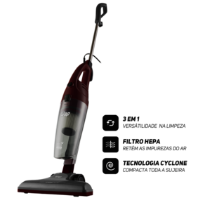 Leve e portátil, ele possui 1350W de potência e é um produto 3 em 1, podendo ser utilizado no formato vertical ou como aspirador de mão com bico múltiplo para diferentes tipos pisos e também com bico canto para limpeza de difícil acesso.