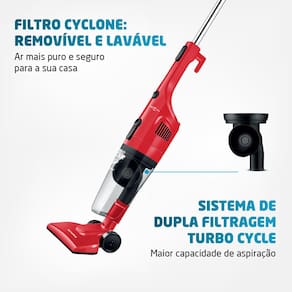 O filtro Cyclone é removível e lavável, ou seja, é mais prático e fácil de limpar, além disso, por não precisar de saco coletor, o aspirador é mais econômico e sustentável. Possui coletor de pó translúcido com capacidade para 1,3 litros, que facilita muito para ver quando está cheio. Haste removível pode ser utilizado como aspirador vertical ou portátil.