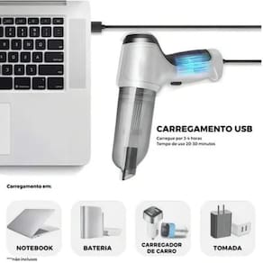 Aspirador de mão sem fio portátil com alta sucção e função soprador. Ideal para limpeza rápida diária, de automóveis e doméstica. Possui acessórios multifuncionais para limpar todos os cantos. Recarregável via USB.Tipo de coletor