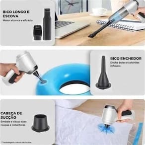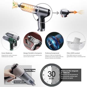 Aspirador de mão sem fio, alta sucção, multifuncional e versátil para automotivo/carro e casa. Possui função soprador. Ideal para limpeza rápida diária, de automóveis e doméstica. Acompanha acessórios multifuncionais para limpar todos os cantos. Recarregável via USB.Tipo de coletor