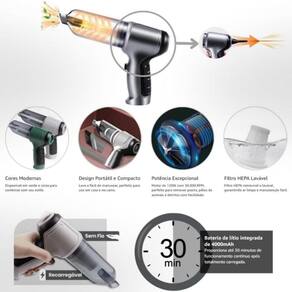 Aspirador de mão sem fio portátil com alta sucção e função soprador. Ideal para limpeza rápida diária, de automóveis e doméstica. Possui acessórios multifuncionais para limpar todos os cantos. Recarregável via USB.Tipo de coletor