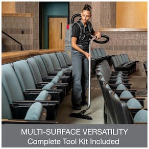 Inclui ferramentas versáteis como haste ajustável, ferramenta de fenda, escova para estofados, escova para poeira, bico para pisos rígidos e bico para carpetes, todas com diâmetro de 38 mm para alcance em áreas elevadas, escadas e superfícies variadas. Estrutura portátil em formato backpack facilita mobilidade em hotéis, escolas e espaços comerciais, com capacidade de 3,8 L no saco descartável para minimizar interrupções.