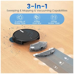Aspirador robô 3 em 1 AIRROBO P30 com funções de varredura, vácuo e esfregão, sucção de 3000Pa, controle via app, Alexa e Google Assistant, navegação por giroscópio, autonomia de 120 minutos e design slim.Tipo de coletor