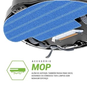 - Possui 2 modos de operação: aspirador para resíduos secos e pano úmido* (mop)