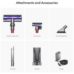 • Conteúdo da caixa: aspirador Dyson V8 Plus, suporte de parede, carregador, escova mini para poeira macia, cabeça Motorbar, ferramenta de fendas, ferramenta Hair Screw, bateria de íons de lítio (1).?