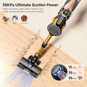 Este aspirador sem fio possui um motor atualizado de 170 W com sucção potente de 30 KPA para limpeza profunda da sujeira em pisos e carpetes. Os aspiradores domésticos têm um display LED em tempo real que mostra potência, modo e bloqueios, além de botões fáceis de usar. O sistema de filtragem HEPA de 6 estágios do aspirador sem fio no copo de 1 L captura 99,99% da poeira de 0,1 mícron para proteger o motor e manter o ar limpo, e o copo grande precisa ser esvaziado com menos frequência. É um aspirador de pó sem fio, leve, 8 em 1 conversível em portátil com acessórios para facilitar a limpeza de várias áreas. Com uma bateria removível de alta capacidade, o aspirador oferece 40 a 45 minutos de tempo de execução no modo econômico e 20 minutos no modo de potência máxima. A escova giratória de 180° para os lados e 90° para cima e para baixo e a luz LED permitem a limpeza de cantos sem saída.