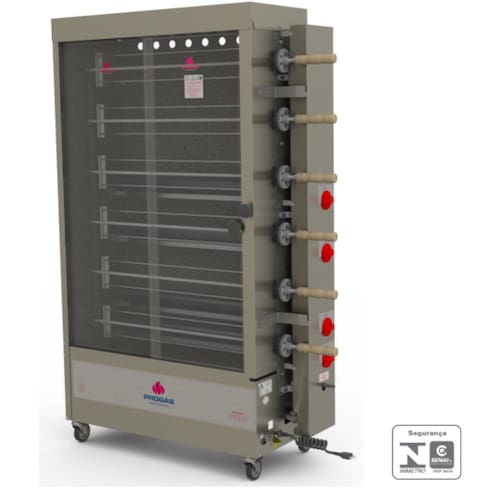 ESPECIFICAÇÕES: 6 espetos do tipo universal ou garfo Capacidade de 5 frangos por espeto Tensão bivolt: 127V/220V Rodízios que facilitam o deslocamento Gaveta coletora de gordura Bacia interna em aço inox Visores de vidros temperados 4 queimadores tubulares a gás baixa pressão