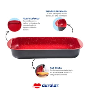 Leve praticidade, saúde e sofisticação para sua cozinha com a assadeira retangular Duralar Red Marble. Com estrutura em alumínio e revestimento nanocerâmico vermelho de alta performance, essa assadeira oferece uma experiência culinária impecável, permitindo o cozimento uniforme e saudável dos alimentos, sem a necessidade de adicionar gorduras, além de ser extremamente fácil de limpar.