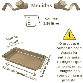 Dimensões aproximadas: 5cm x 22cm x 32cm Material: Aço Carbono Com Revestimento Antiaderente Conteúdo: 1 Assadeira Antiaderente