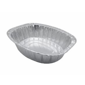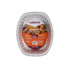 Assadeira descartável de alumínio na forma oval, utilizada para acondicionamento e embalagem de alimentos, de espessura de 0,108 mm e capacidade de 7000ml. Sem suporte, não gravadas