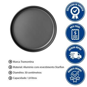 - Chame os amigos que é hora de pizza! E com a assadeira para pizza Tramontina em alumínio com revestimento interno e externo antiaderente Starflon Max grafite 30 centímetros de diâmetro 1,8 litros você irá tornar esse momento ainda mais especial.