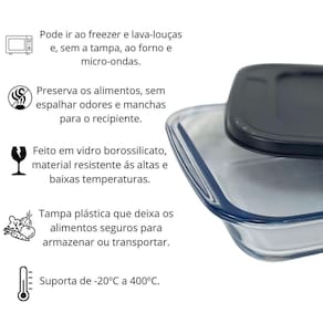 A Assadeira com Tampa é sinônimo de praticidade para qualquer amante de culinária Produzida em vidro refratário, é ideal para assar e aquecer uma grande variedade de alimentos. Livre de BPA, pode ser utilizada sem tampa em fornos e micro-ondas pois resistente a temperaturas de -20C a 400C. Seja para preparar uma deliciosa lasanha, brownies, legumes assados, batatas rústicas, um suculento assado ou simplesmente aquecer refeições, a assadeira atende a todas as suas necessidades com excelência. Após o uso, a tampa plástica ainda garante a boa conservação dos alimentos; assegurando a preservação da refeição sem risco de cheiro residual. Além de tudo, é super fácil de limpar