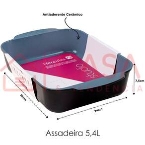 - capacidade: 5,4 litros - tamanho: 5,4 litros 35comprimento x 24largura x 7,5altura cm - corpo em alumínio fundido - antiaderente cerâmico - pintura resistente a altas temperaturas - pode ir ao forno e lava louças - pode ir ao fogão convencional e fogão halogênio - contém: 1 assadeira retangular na cor preta de 5,4 litros 35x24cm. Especificações: marca: hercules; garantia: 3 meses;