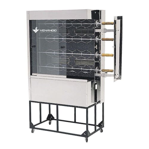 Equipamento de acordo com a portaria 371/09 do INMETRO com selo de conformidade, a Máquina de Assar Frangos possibilita assar vários tipos de alimentos. Conta com acabamento interno esmaltado a fogo, externo em aço inox 430, isolamento térmico em lã de rocha e espetos equipados com ganchos duplos e simples para melhor fixação dos frangos.