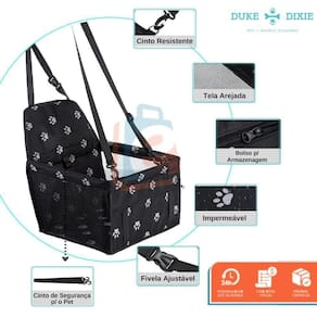 O assento para carro da Duke e Dixie é ideal para passeios, além de oferecer conforto e segurança para o seu pet. Produzido de acordo com as normas de trânsito para transportar animais em veículos, é adaptável com a maioria dos assentos dos automóveis que tenham encosto de cabeça. Confeccionado em material impermeável oxford em todo o assento e ganchos resistentes de fácil instalação garante segurança ao transportar seu pet. Possui tela arejada nas laterais para melhor ventilação. Acompanha fivelas ajustáveis para todo tipo de carro; e bolso com zíper para armazenagem de brinquedos, aperitivos, remédios e outros. - Adaptável a maioria dos assentos de automóveis;- Indicado ao transporte de cães e gatos de até 6kg;- Possui cinto de segurança acoplado a cadeira;- Fácil instalação, fixado no próprio cinto de segurança e banco do carro;- Proporciona ao seu pet um passeio agradável e aos donos um transporte mais seguro;- Protege o assento do automóvel de sujeiras;- Dobrável e fácil de transportar;- Altura regulável. INSTRUÇÕES DE USO:- Apoie a bolsa no assento do banco do carro;- Passe as alças de apoio por trás do encosto de cabeça do banco do carro e ajuste-as até ficarem esticadas;- Coloque o cinto de segurança por dentro dos passadores;- Coloque o pet dentro da bolsa, prendendo a guia fixa interna na coleira do animal. CARACTERÍSTICAS TÉCNICAS:Material: Tecido oxford, espuma e pvcMedidas: 45cm altura total x 34cm largura x 40cm comprimento x 25cm altura do cesto Indicação: Cão e gato de porte pequeno até 6kg Marca: Duke e DixieRef.: 1500503