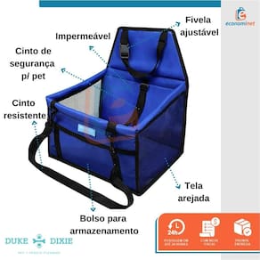 O assento para carro da Duke e Dixie é ideal para passeios, além de oferecer conforto e segurança para o seu pet. Produzido de acordo com as normas de trânsito para transportar animais em veículos, é adaptável com a maioria dos assentos dos automóveis que tenham encosto de cabeça.