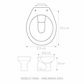 Assento Sanitário (tampa de vaso) fabricado em madeira MDF com pintura laqueada, com proteção raios UV, que garante excelente acabamento e durabilidade. Compatível com vasos (bacias/louças) sanitários com ou sem caixa acoplada. Tem calços de PVC instalados na tampa e no assento para proporcionar estabilidade ao uso, pois distribui o peso uniformemente sobre a louça sanitária. Montagem simples e fácil. Possui ferragem em alumínio anodizado que não enferruja/oxida e oferece muita resistência. O assento é acompanhado por parafusos para instalação. Embalagem dupla reforçada garante o recebimento do produto totalmente protegido. Especificações: - Dimensões da caixa: largura: 51,50cm. Altura: 4,00cm comprimento: 38,00cm - Peso do produto: 1,98kg - Acabamento: brilhante - Uso: este assento é adequado para uso na louça Deca de modelo Targa - Garantia: 3 meses - Itens inclusos: Tampa e assento com calços de PVC, ferragem inoxidável, embalagem duplamente reforçada. Contém todos os parafusos e encaixes para instalação, sendo necessária somente uma chave de fenda para instalar o produto na louça sanitária. Instalação: posicione o produto, devidamente centralizado, em cima do vaso sanitário. Sem desmontar a ferragem, insira as buchas de borracha dentro dos furos da bacia sanitária. Utilizando uma chave de fenda, aperte o parafuso no sentido horário até que o assento esteja firme no vaso. Manutenção: recomendamos a limpeza periódica com pano levemente umedecido com sabão neutro. Não usar esponjas abrasivas ou palha de aço nem qualquer tipo de produto químico. Marca: LOJAROCCA