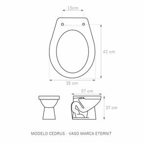 Assento Poliéster Laminado Cedrus Branco Tampa Vaso Etern Branco Assento Sanitário tampa de vaso fabricado em madeira MDF revestido com laminado poliéster, com excelente acabamento fosco e texturizado o que garante uma durabilidade maior. A laminação de poliéster torna este produto impermeável e de fácil limpeza e higienização. Compatível com vasos bacias/louças sanitários com ou sem caixa acoplada. Os calços de PVC são instalados na tampa e no assento antes da laminação para evitar a entrada da água ou que eventualmente se soltem. Montagem simples e fácil. Possui ferragem em alumínio anodizado que não enferruja/oxida e oferece muita resistência. O assento é acompanhado por parafusos para instalação. Embalagem dupla reforçada garante o recebimento do produto totalmente protegido. Especificações: - Dimensões da caixa: largura: 51,50cm. Altura: 4,00cm comprimento: 38,00cm - Peso do produto: 1,98kg - Acabamento: fosco e texturizado - Uso: este assento é adequado para uso na louça Eternit modelo Cedrus - Garantia: 3 meses - Itens inclusos: Tampa e assento com calços de PVC, ferragem inoxidável, embalagem duplamente reforçada. Contém todos os parafusos e encaixes para instalação, sendo necessária somente uma chave de fenda para instalar o produto na louça sanitária. Instalação: posicione o produto, devidamente centralizado, em cima do vaso sanitário. Sem desmontar a ferragem, insira as buchas de borracha dentro dos furos da bacia sanitária. Utilizando uma chave de fenda, aperte o parafuso no sentido horário até que o assento esteja firme no vaso. Manutenção: recomendamos a limpeza periódica com pano levemente umedecido com sabão neutro. Não usar esponjas abrasivas ou palha de aço nem qualquer tipo de produto químico. Marca: Lojarocca