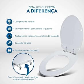 Itens inclusos: assento e tampa em madeira MDF com pintura laqueada. Ferragens metálicas em alumínio anodizado muito resistente, não oxidam e não enferrujam.