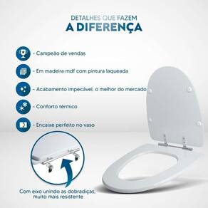 Itens inclusos: assento e tampa em madeira MDF com pintura laqueada. Ferragens metálicas em alumínio anodizado muito resistente, não oxidam e não enferrujam.