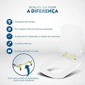 Durabilidade e Resistência: Fabricado em MDF com camadas de pintura laqueada, este assento oferece não apenas beleza, mas também conforto térmico e alta resistência. Seu acabamento impecável adiciona um toque de classe ao seu banheiro.