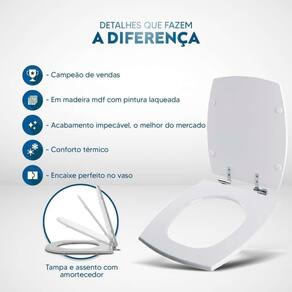 Durabilidade e Resistência: Fabricado em MDF com camadas de pintura laqueada, este assento oferece não apenas beleza, mas também conforto térmico e alta resistência. Seu acabamento impecável adiciona um toque de classe ao seu banheiro.