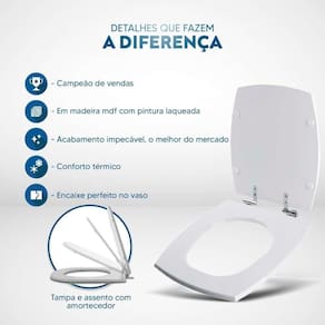 Durabilidade e Resistência: Fabricado em MDF com camadas de pintura laqueada, este assento oferece não apenas beleza, mas também conforto térmico e alta resistência. Seu acabamento impecável adiciona um toque de classe ao seu banheiro.