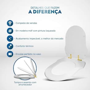 Durabilidade e Resistência: Fabricado em MDF com camadas de pintura laqueada, este assento oferece não apenas beleza, mas também conforto térmico e alta resistência. Seu acabamento impecável adiciona um toque de classe ao seu banheiro.