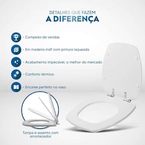 Durabilidade e Resistência: Fabricado em MDF com camadas de pintura laqueada, este assento oferece não apenas beleza, mas também conforto térmico e alta resistência. Seu acabamento impecável adiciona um toque de classe ao seu banheiro.