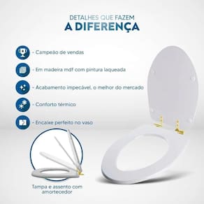 Durabilidade e Resistência: Fabricado em MDF com camadas de pintura laqueada, este assento oferece não apenas beleza, mas também conforto térmico e alta resistência. Seu acabamento impecável adiciona um toque de classe ao seu banheiro.