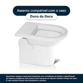 Detalhes e Cuidados Especiais: * Cor: Cinza Real * Compatibilidade: Modelo Duna da marca Deca * Conteúdo da Embalagem: Assento sanitário, parafusos de fixação e instruções de instalação. * Fabricante do Assento Sanitário: Pontto Lavabo.