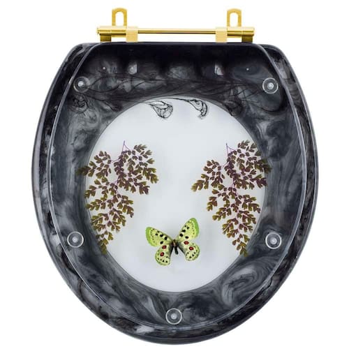 O Assento Sanitário Decorado Oval Convencional Preto Com Borboleta Verde para todas as marcas Com Ferragem Dourada é a opção ideal para quem busca combinar funcionalidade com elegância em seu banheiro.
