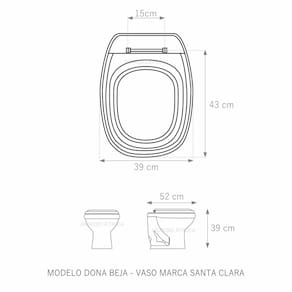 Assento Sanitário Almofadado (tampa de vaso) fabricado em polipropileno e polietileno especial. Resistente, durável, com excelente acabamento e design sofisticado. Assento macio, arco almofadado.Devido a sua composição este produto é totalmente impermeável e de fácil limpeza e higienização. Compatível com vasos sanitários de descarga convencional e também vasos com caixa acoplada. Acabamento brilhante no tampo e no assento. Fixação regulável para o perfeito encaixe na louça sanitária. Fácil limpeza, é higiênico e não acumula sujeira. O assento é acompanhado por parafusos para instalação e acabamentos. Embalagem dupla reforçada garante o recebimento do produto totalmente protegido. Especificações: - Dimensões da caixa: largura: 50,00cm. Altura: 4,00cm comprimento: 40,00cm - Acabamento: brilhante - Uso: este assento é adequado para uso na louça Santa Clara modelo Dona Beja - Garantia: 3 meses - Itens inclusos: Tampa e assento, parafusos e embalagem duplamente reforçada. Instalação: posicione o produto, devidamente centralizado, em cima do vaso sanitário. Encaixe os parafusos e encaixe as porcas. Aperte até que o assento esteja firme no vaso. Manutenção: recomendamos a limpeza periódica com pano levemente umedecido com sabão neutro. Não usar esponjas abrasivas ou palha de aço nem qualquer tipo de produto químico.