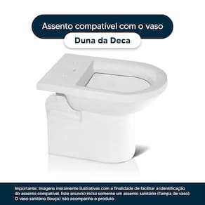 Este assento sanitário é compatível para uso em vaso sanitário Deca modelo Duna com ou sem caixa acoplada.