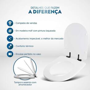 Itens inclusos: assento e tampa em madeira MDF com pintura laqueada. Ferragens na cor Preta em alumínio anodizado muito resistente, não oxidam e não enferrujam.