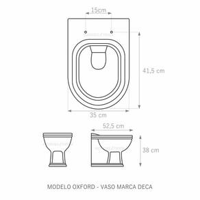 Assento Sanitário Almofadado (tampa de vaso) fabricado em polipropileno e polietileno especial. Resistente, durável, com excelente acabamento e design sofisticado. Assento macio, arco almofadado.Devido a sua composição este produto é totalmente impermeável e de fácil limpeza e higienização. Bactericida, contém proteção contra fungos e bactérias. Compatível com vasos sanitários de descarga convencional e também vasos com caixa acoplada. Acabamento brilhante no tampo e no assento. Fixação regulável para o perfeito encaixe na louça sanitária. Fácil limpeza, é higiênico e não acumula sujeira. O assento é acompanhado por parafusos para instalação e acabamentos. A tampa não cai, o sistema mantém o assento em pé quando aberto. Embalagem dupla reforçada garante o recebimento do produto totalmente protegido. Especificações: - Dimensões da caixa: largura: 50,00cm. Altura: 4,00cm comprimento: 40,00cm - Acabamento: brilhante - Uso: este assento é adequado para uso na louça Deca modelo Oxford - Garantia: 3 meses - Itens inclusos: Tampa e assento, parafusos e embalagem duplamente reforçada. Instalação: posicione o produto, devidamente centralizado, em cima do vaso sanitário. Encaixe os parafusos e encaixe as porcas. Aperte até que o assento esteja firme no vaso. Manutenção: recomendamos a limpeza periódica com pano levemente umedecido com sabão neutro. Não usar esponjas abrasivas ou palha de aço nem qualquer tipo de produto químico.